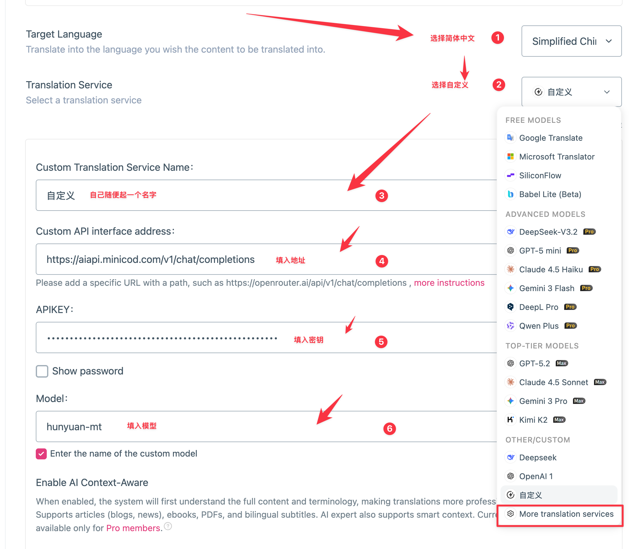 这一步,我们需要进入到沉浸式翻译插件的配置后台,把信息填写进去: