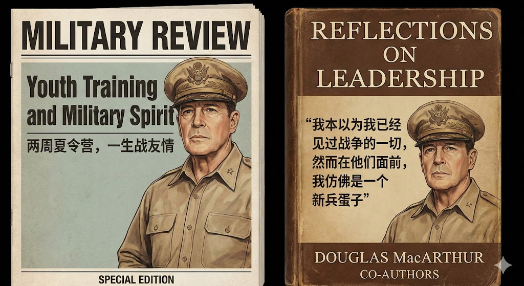 "我本以为我已经见过战争的一切,然而在他们面前,我仿佛是一个新兵蛋子"出自麦克阿瑟与同事 1951 年合著的书籍 Reflections on Leadership。(图片基于哈基米3.0生成)