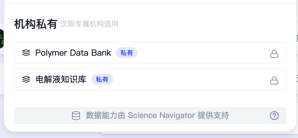 这里面的资源筛选分两块,一个是学科的筛选,另一个是资源库的筛选。实际体验下来,如果是学科的筛选,向一个领域细分,往往并不能帮助你获取到你想要的文献。如果一开始的搜索方向错了,改变一个领域,确实精准很多。然后是资源库的筛选,这里面提供了自建私有知识库的能力,还有两个和刚才上文提到的「私有模型」一个套路的东西——私有知识库。是的,也是给看不给用。