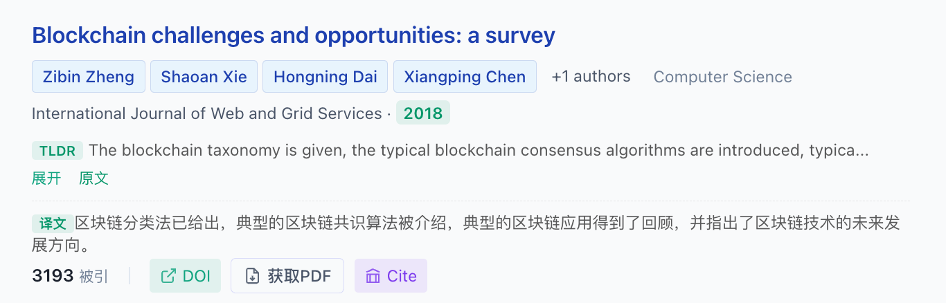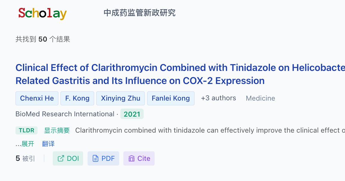scholay的搜索结果部分,给人的感觉是把常规和创造性,做了较好的融合。一篇参考文献的基础信息包含:标题、作者、摘要、领域、引用量、doi号、pdf下载链接、4种引用格式。除此之外,它支持基于AI的翻译功能,给非英语母语者提供了便利。
