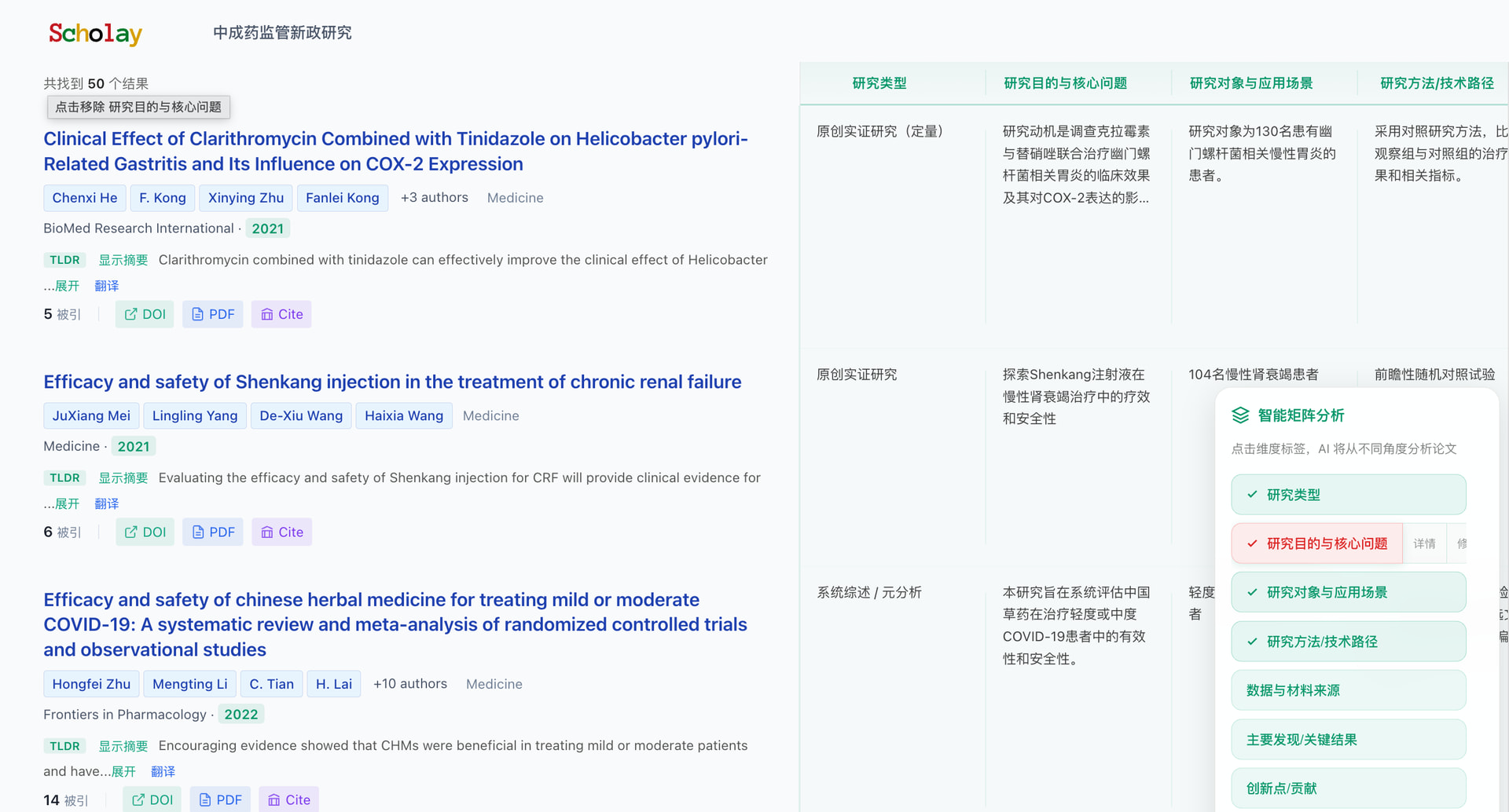 没错,scholay也做了,这个功能看起来还是比较能打,因为通过横向比较,我们发现,目前的矩阵化分析方案,需要满足这样几个要求: 1. 交互友好,有的网站做出来之后有点卡顿,这个影响体验 2. 提示词工程优良,有的产品在这里做的维度分析效果很差 3. 高度客制化,为了保证多种学科可用,这个地方要求对按钮、提示词的定制化才行。