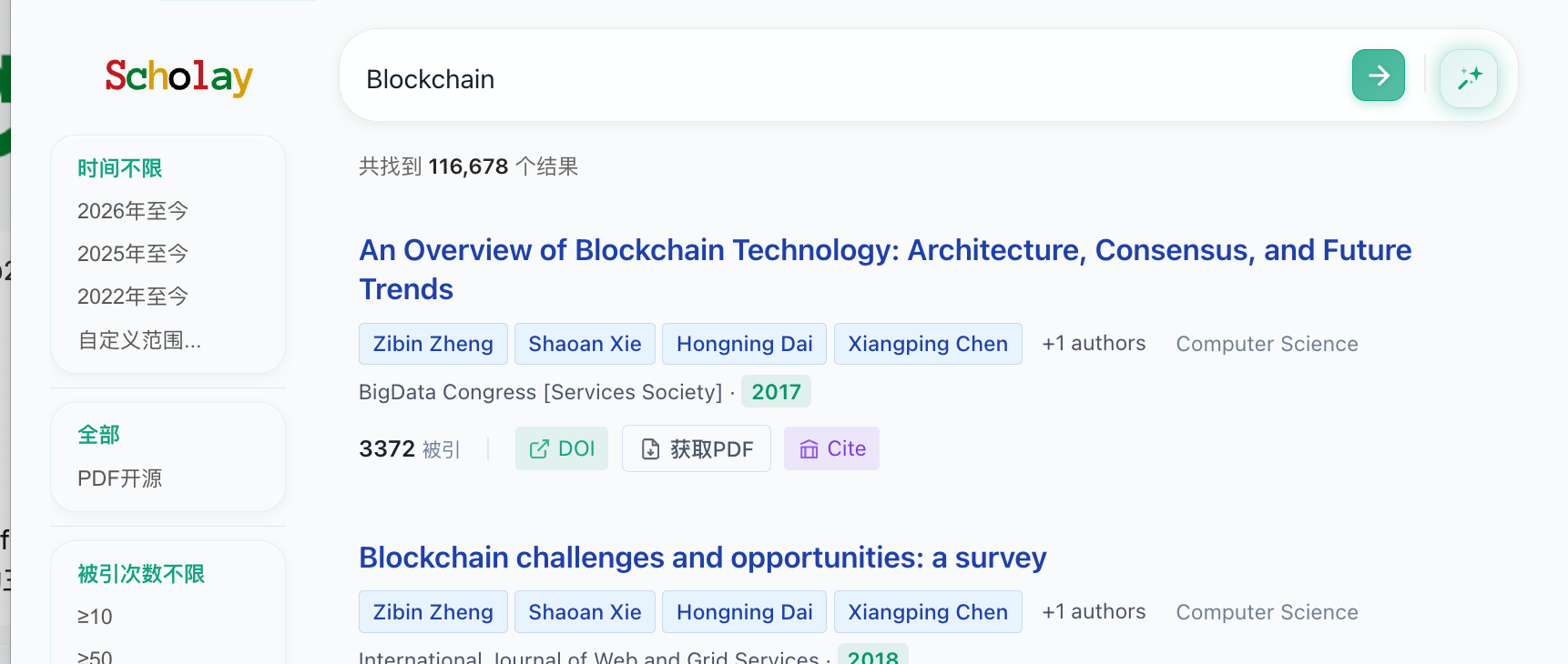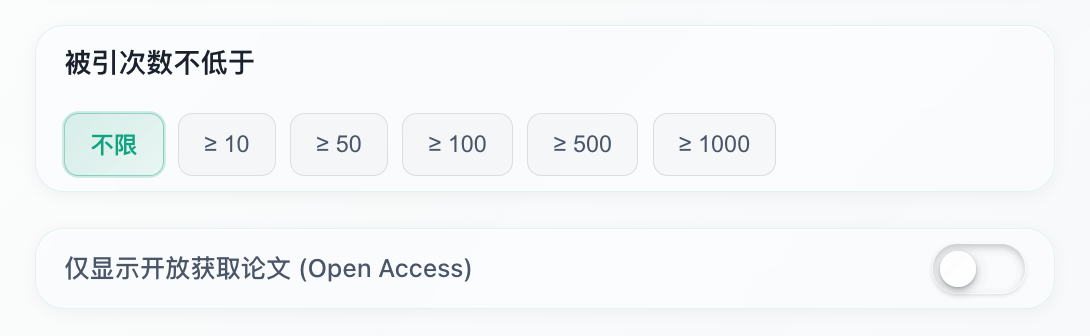 这虽然不是创新,但就目前所有学术搜索产品而言,最大的难度莫过于对私有文献数据库的维护。因此除了几个头部的文献搜索引擎之外,我们极难看到搜索产品支持对筛选条件的限制。scholay在这一个功能上的对齐,代表着它们和竞争对手之间,从数据源上获得了先发优势。